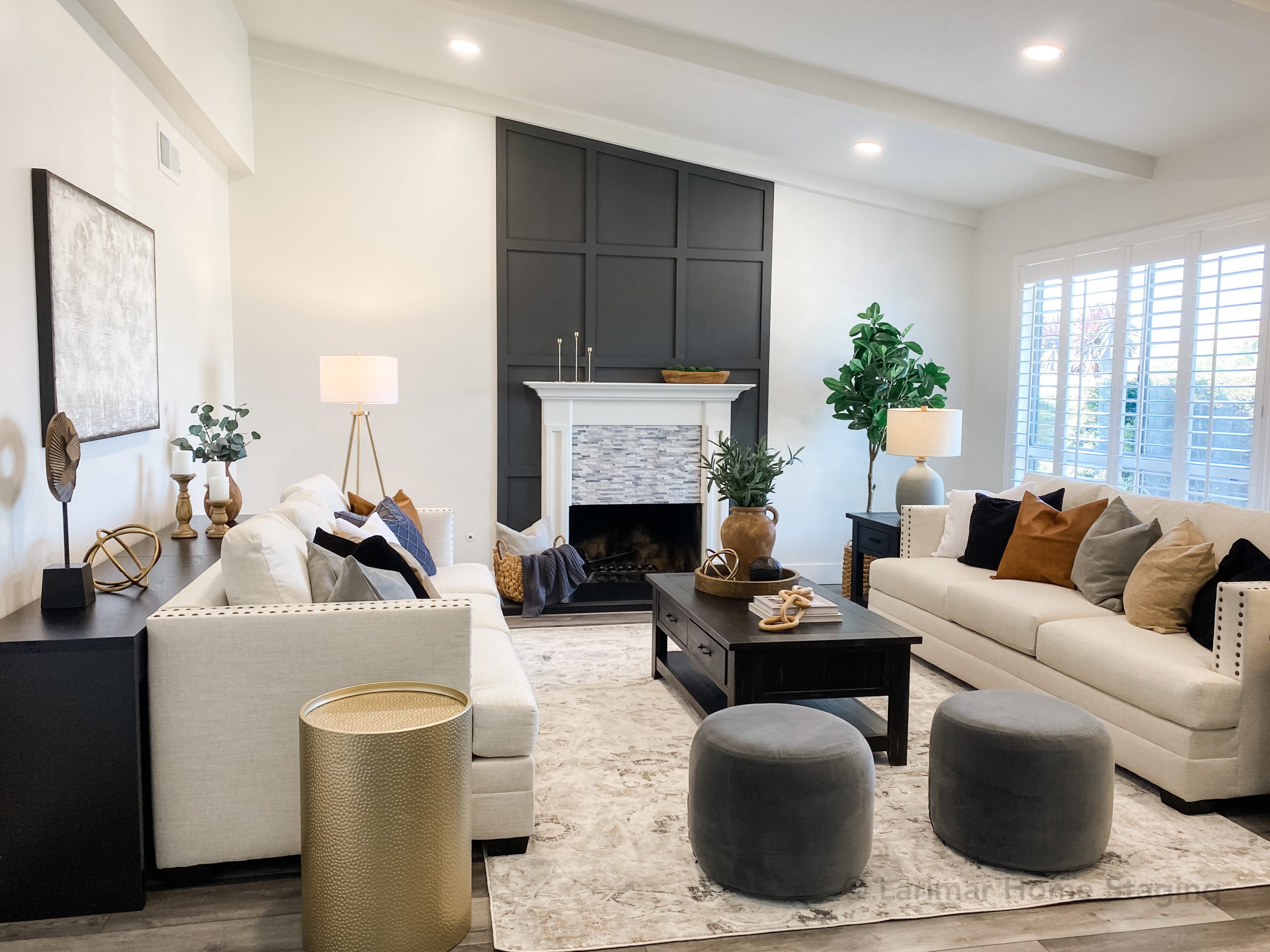 When staging a home to sell, it's important to draw the buyers' eyes to architectural features such as fireplaces. You can't really tell, but there is more space on the right side of this fireplace than there is on the left. Therefore, the sofa on the right and the end tables were floated away from the wall. Also, the coffee table needs to be centered with the fireplace, so the sofa on the left was also floated away from the wall and two console tables were placed behind to fill the gap. The gap behind the sofa on the right allows for space to get to the windows so the shutters can be closed and opened without climbing over the sofa.